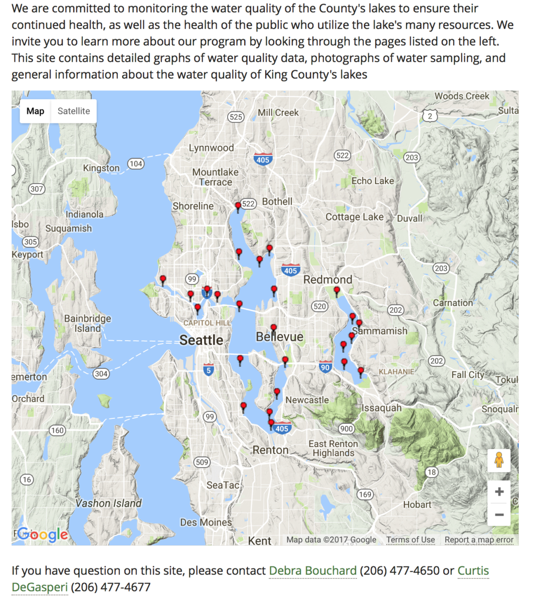 7.1 King County operates a large scale monitoring programme over their major lakes, of which Lake Washington is just one.