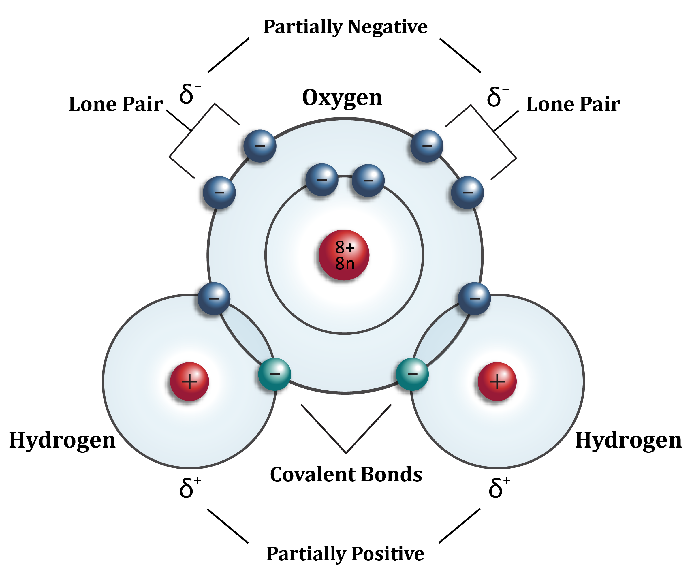 4.7.3 A water molecule is not just very small, its atomic structure is asymmetrical in three dimensions, which gives it polarity – the side where the two hydrogen atoms sit has a slightly positive charge and the opposite side is slightly negatively charged. So the molecule is a ‘di-pole’.